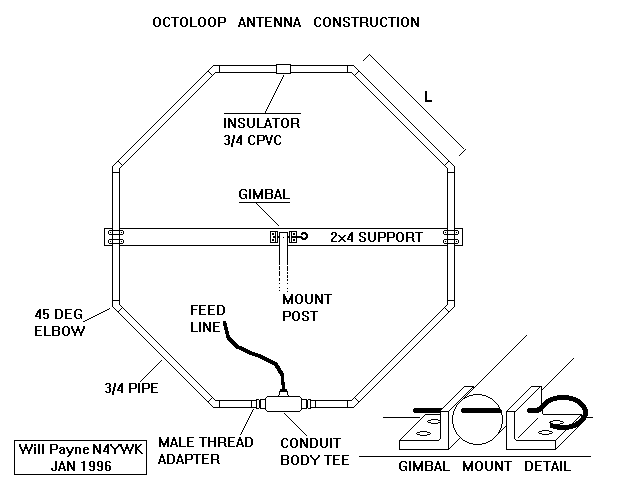 N4YWK предложил рамочную антенну под названием OCTOLOOP(восьмиугольная петля). Основу антенны составляет медная труба диаметром ¾ дюйма в которой вставлен отрезок 25 парного телефонного кабеля. Концы проводников кабеля соединяются последовательно, так, чтобы получилась рамка состоящая из 50 витков. Длина отрезка кабеля и периметр медной трубы примерно 36 футов(1 фут = 304,8 мм) Как и в предыдущей конструкции, медная труба разрезана в верхней части, а ее концы внизу, соединения проводов и предварительный усилитель помещены в экранирующую коробку.