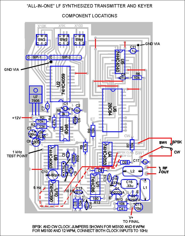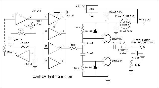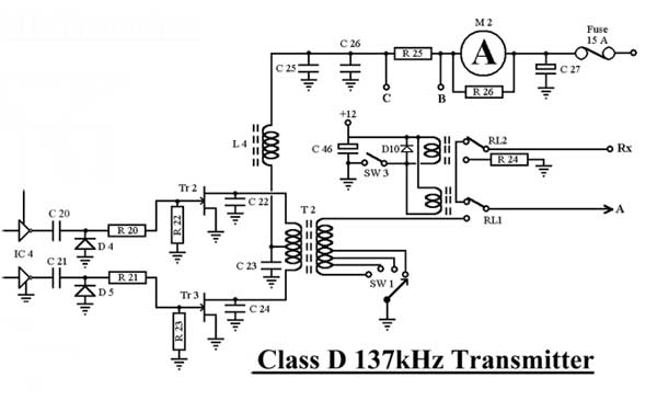 В этой схеме необходимая частота получается путем вычитания частот двух кварцованых генераторов, один из которых может перестраиваться в пределах 2-3 кГц. В результате получившимся VFO перекрывается весь участок 135,7 – 137,8 кГц. Третий каскад является одновременно управляемым усилитеолем, на который подается сигнал манипуляции. Выходной каскад служит для согласования с оконечным усилителем.