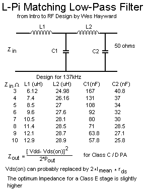 Наконец в недрах Интернета мне удалось обнаружить схему и данные П-контура для диапазона 137 кГц, для разных значений входных сопротивлений. Это может вам пригодиться при конструировании усилителей и антенных согласующих устройств.